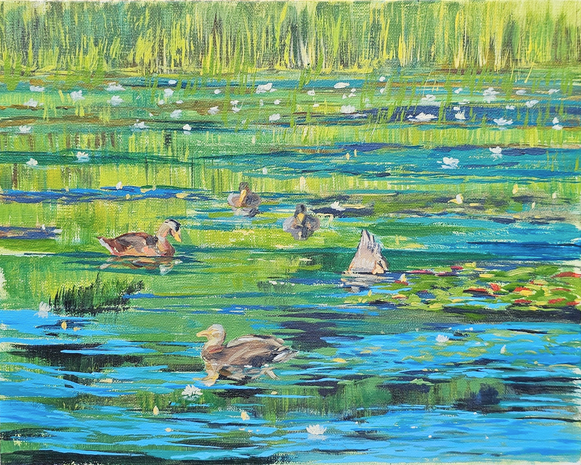 Waterlilies and DucksPlein Air 2, painted at Hamilton Pond, Bar HarborOil on 6 x 6 boardAvailable